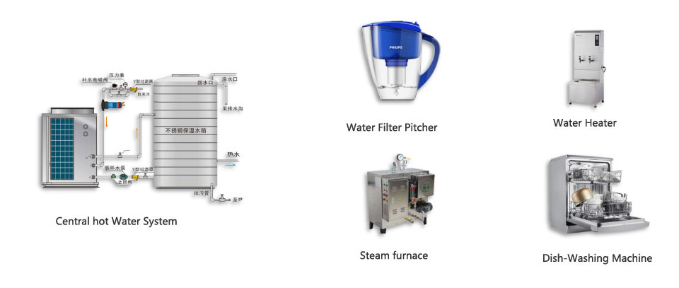 Domestic hot water system including electric water heater, solar water heater, gas heater, air energy heater etc.. When these heater are used in hard water areas, the scales will gradually adhere to the inner heating tube, the solar evacuated tube、heat transfer system and water storage tank, lower the thermal conversion, increase Electricity power and energy consumption. According to the test, if the thickness of the adhered scale of the heating tube and solar vacuum wall reaches 1 mm, the energy consumption raises 10%. If the thickness of the scales reaches 2mm, the energy consumption increases to 30%. The thickness of 2mm will be reached in 2 months in hard water area.